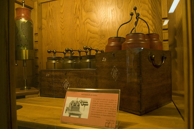 但是,那時代人對於「電學」的掌握其實有待加強,如前所述,伏打還要經過一系列實驗,在跨世紀的 1800 年才會發明電池(並打臉當時已故的伽伐尼)。在電池發明前,要進行電擊,得用一種「摩擦起電機」並將電荷傳遞、儲存在相當於電容器的「萊頓瓶」裡:此物也是富蘭克林放風箏試著要將閃電儲存起來時使用的實驗道具,它的放電迅速,火花趴一聲就沒了,不能像電池般穩定供電。