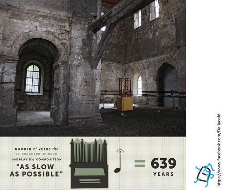在德國哈伯斯塔(Halberstadt)小鎮的聖布爾赫德教堂(St. Burchardi church)裡,世界上最著名的「慢歌」正在慢慢的被演奏著。為什麼著名呢?因為這是史上最慢的音樂了,它到現在還沒被演奏完。