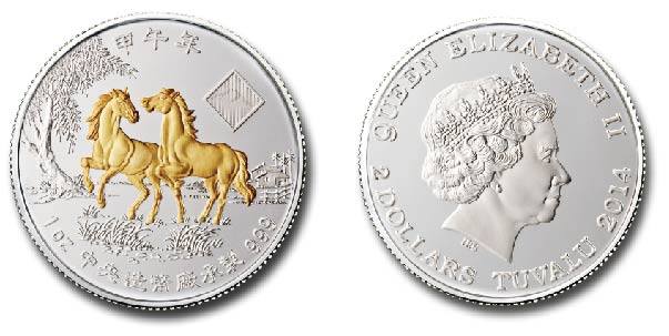 這張圖片是臺灣銀行委託中央造幣廠鑄造,今年9/12開始發售的「甲午馬年精鑄生肖銀幣(鍍金版)」,一枚售價是2080元。正面由兩匹駿馬構成主題圖案,但你有沒有注意到右邊的人頭竟然是英國女皇伊莉莎白二世(Elizabeth II),而不是蔣介石、孫文等人呢?細看上面寫的字樣:「2 DOLLARS TUVALU」,這竟然是一枚有著吐瓦魯貨幣面額的硬幣!