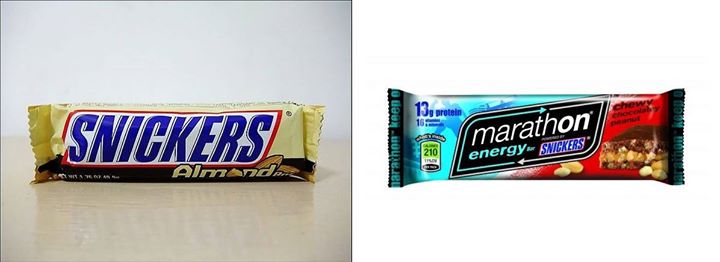 雖然後來改回Snickers這世界通用的名稱,但是在改名之初,怕英愛兩地的消費者無法辨識,所以一度使用Snickers Marathon Energy bar(圖右) 的名稱。看來傻摺疊童年推測還是有其道理的XD