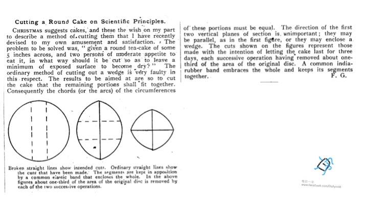 #聞史迭 我特地跑到期刊資料庫,去找到了這篇1906年由英國數學家 Francis Galton 所投稿的短篇文章,而且原本還差點找不到!原來 Galton 雖然是 Nature 期刊的常客(如果他是現代人的話,應該會被當神一樣拜吧),不過這篇名叫 “Cutting a Round Cake on Scientific Principles" [1] 的文章,卻是用 F.G. 的縮寫投稿的,因此在資料庫中被歸類為匿名文章。