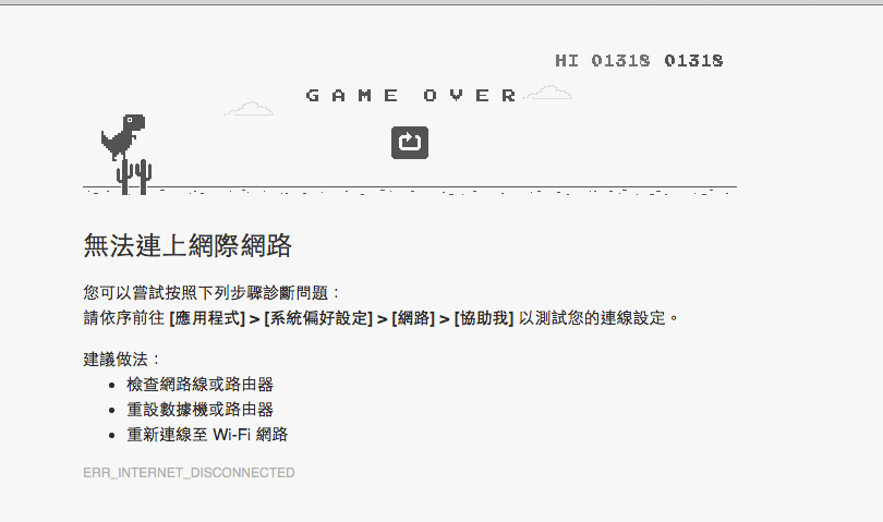 相信各位讀者應該都跟我聞史迭一樣,沒有網路比沒有飯吃還難受,如果斷網一分鐘就跟窒息一分鐘一樣痛苦吧?各位應該都有遇過無線網路暫時不通,或者在學校遇到宿舍斷網的經驗。使用 Chrome 瀏覽器的朋友,應該都對這隻小恐龍不陌生。看到它跟你 say hello,就表示你的網路斷囉!