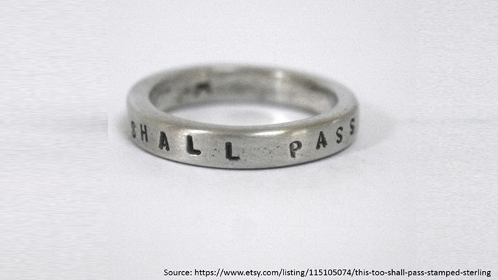“This too shall pass"是一句流傳已久的諺語,在波斯的詩作還有猶太的民間故事中都曾提到這句話的故事。在猶太的故事中,所羅門王想要給他的大臣「上一課」,給他六個月,故意要他去找一個可以讓快樂的人哀傷、讓憂傷的人快樂的指環。六個月很快就過去了,眼看著明天就要交出指環給所羅門王了,大臣仍然一無所獲。喪氣地走回皇宮的路上,大臣抱著最後一絲希望,問了市集裡面的珠寶工匠,有沒有這樣的一個指環?