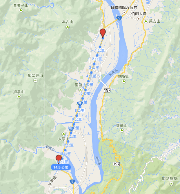 而這段最長的直線公路台9線,北自329K的德高至343.5K的武陵,共約14.5公里的路程幾乎沒有轉彎,在地圖上看起來直得不可思議~