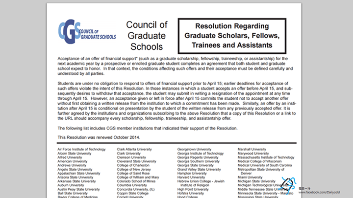 然而很多人以為415大限只是一個不成文的規定,或者只是一個都市傳說或潛規則。其實你知道嗎?各大研究所最慢會在四月十五放榜,是受到【四月十五決議案】( April 15 Resolution)的影響。這個由超過300所大學院校簽署的決議案,明文寫了為了保障申請者(也就是學生)選擇的權利,各簽署學校不得於每年四月十五日前要求申請者作出決定,亦即學生決定是否要接受學校入學許可的期限,不會早於四月十五日。