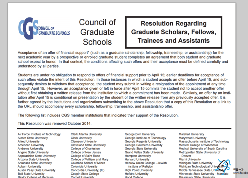 然而很多人以為415大限只是一個不成文的規定,或者只是一個都市傳說或潛規則。其實你知道嗎?各大研究所最慢會在四月十五放榜,是受到【四月十五決議案】( April 15 Resolution)的影響。這個由超過300所大學院校簽署的決議案,明文寫了為了保障申請者(也就是學生)選擇的權利,各簽署學校不得於每年四月十五日前要求申請者作出決定,亦即學生決定是否要接受學校入學許可的期限,不會早於四月十五日。