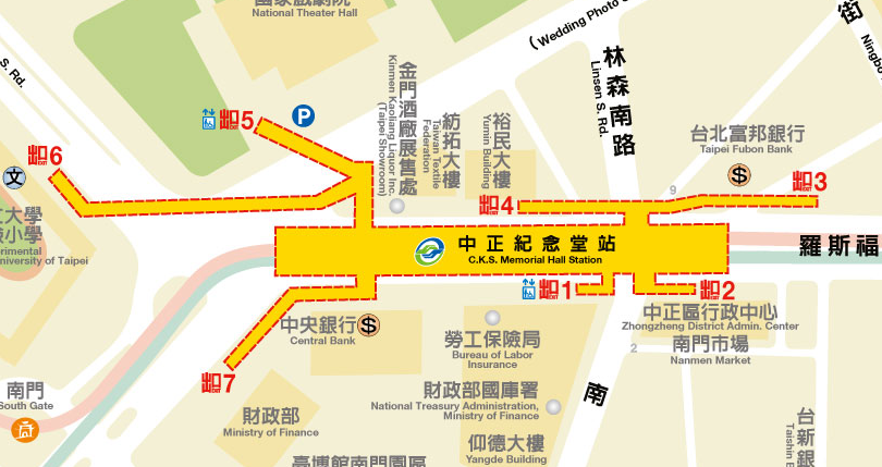 但是以上圖的中正紀念堂為例,因為南北端並無相連,因此將兩個穿堂層的出口群組各自依照逆時針編號。
