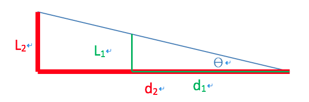 簡單來說當角度[math] theta [/math]為定值的兩個一大一小三角形,小三角形以綠色表示,大三角形以紅色表示,[math] theta [/math] 角的對邊與底邊將始終維持固定比例,也就是 [math] frac{L_1}{L_2} = frac{d_1}{d_2} [/math]。
