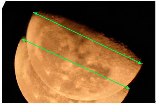 再來就是量測月球的視直徑了,直接對月球的兩端點量測,得出兩顆月亮平均的直徑約為657.57 pixel。