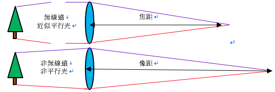 「焦距」是指當物體無窮遠時,平行光線通過透鏡後,由鏡心起算至後方匯聚點的距離,每片透鏡在研磨好時焦距已經被決定,無法再改變(除非你有辦法凹折鏡片 XD)