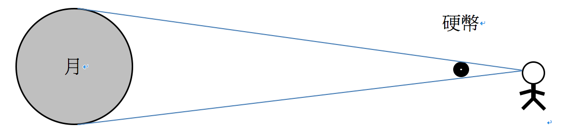 希巴古斯當年的作法是… 調整硬幣與人之間的距離( [math] d_1 [/math]),調整至硬幣看起來的視直徑與月球視直徑一樣大時,紀錄下硬幣與人之間的距離 [math] d_1 [/math],利用已知的月球直徑 [math] L_2 [/math] 與硬幣直徑 [math] L_1 [/math],便可以求得月球的距離 [math] d_2 [/math]了!