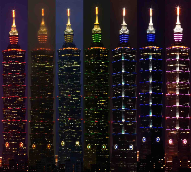 不過,其實台北101外牆的燈號,本來就會隨著星期幾而更換顏色,周一是紅色、周二是橘色,依此類推周日是紫色,也就是說周六的今天原本是靛色的。
