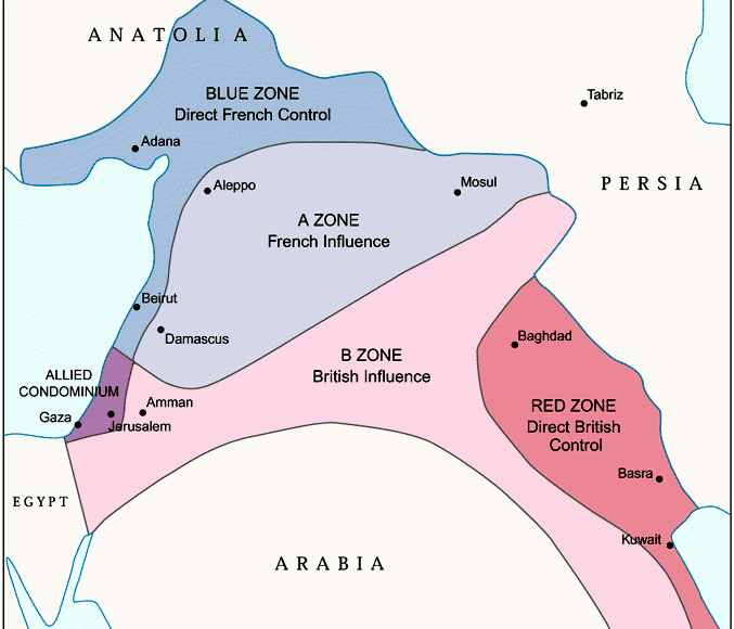 為了爭取鄂圖曼帝國內部阿拉伯人與猶太人的支持,英國做出了許多承諾,包含支持穆罕默德後裔哈希姆家族在戰後建國的《麥克馬洪—哈希姆通信》,也有支持猶太人在巴勒斯坦建立勢力範圍的《貝爾福宣言》;但是在一次大戰結束前,英法俄又有秘密地討論戰後奧斯曼帝國潰散後,三國該如何瓜分在中東的勢力範圍。在1915年的5月16日,由英國的馬克.賽克斯Mark Sykes、法國的弗朗索瓦·皮科François Georges-Picot以及隨後加入的俄羅斯帝國,簽署了這份瓜分中東的協定,而這份協定便以這兩人的姓氏命名為《賽克斯-皮科協定》。