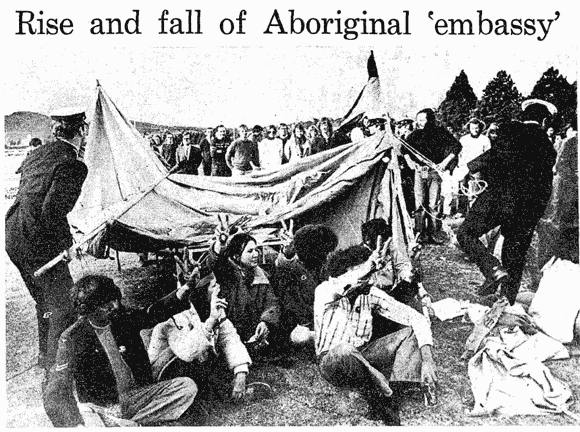 這一連串令人義憤填膺的爭議,讓the Black Caucus這個在澳洲原住民族運動中重要的組織之一派出四個人,他們在坎培拉舊國會大廈前架起陽傘向政府抗議,要求政府必須有誠意的出面解決此爭議。這項行動很快引起不少人響應,於是陸續有人帶著帳篷前來支援,並有長期抗戰的打算。這是帳篷大使館的起源,此後持續有人來來去去的支援,不論那天是100個帳篷還是只有5個帳篷,他們就是在那兒屹立數十年不搖。