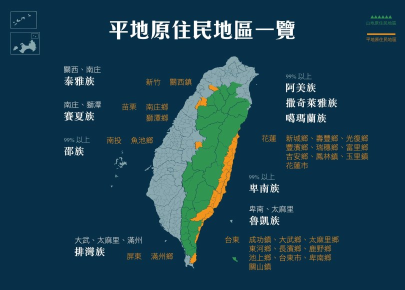 而且在《原住民身分法》第二條的規範下,阿美族人有99%都被歸為平地原住民,甚至山地賽夏族跟平地賽夏族的差別其實就只是1945年以前住在不同地方而已。