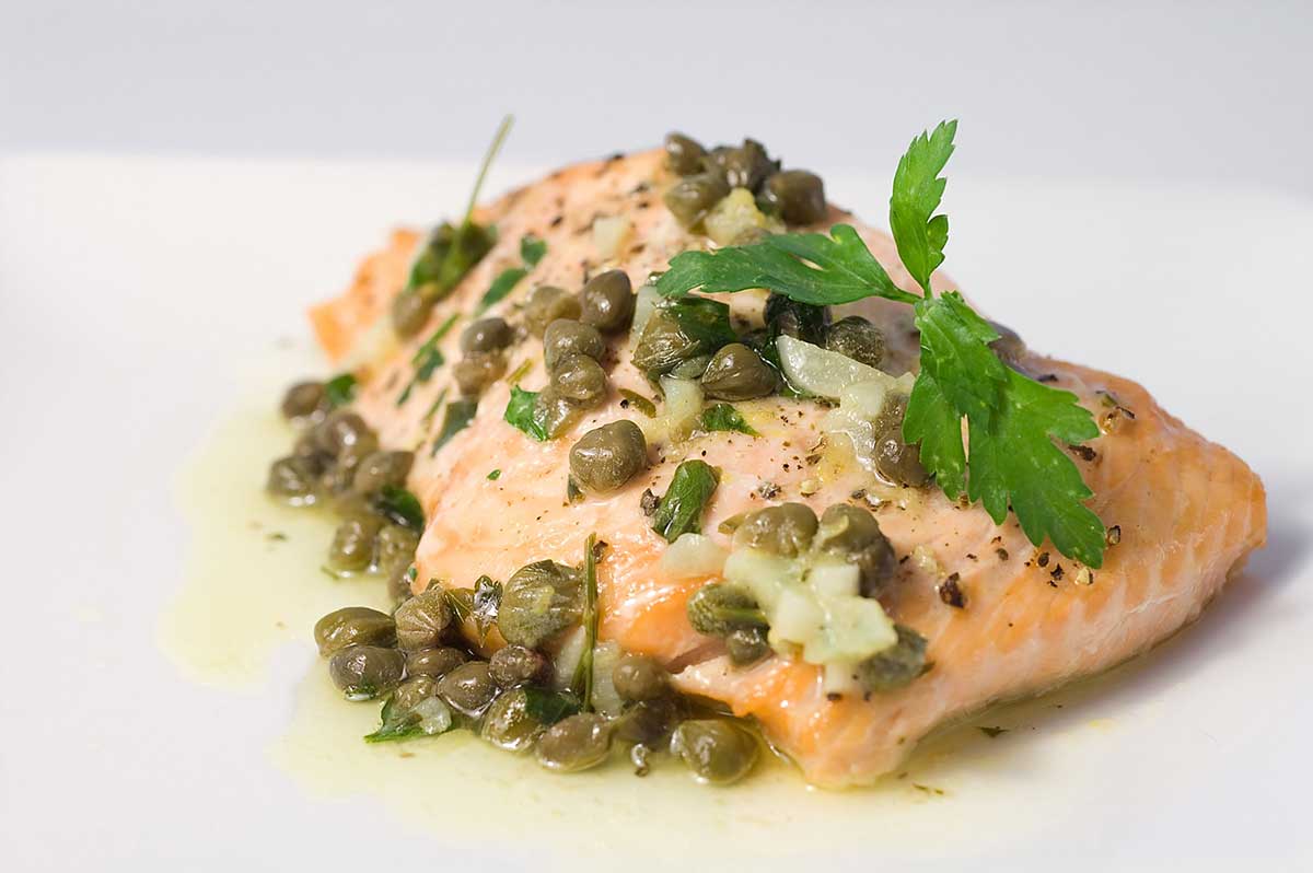 酸豆又酸又鹹,在義大利菜裡時常出現,也常常與橄欖作伙出現,例如酸鮮嗆辣的煙花女義大利麵(pasta puttanesca)就同時用了酸豆與黑橄欖來提味。酸豆酸鹹的香氣也很適合像鮭魚這樣富含油脂的魚呢!