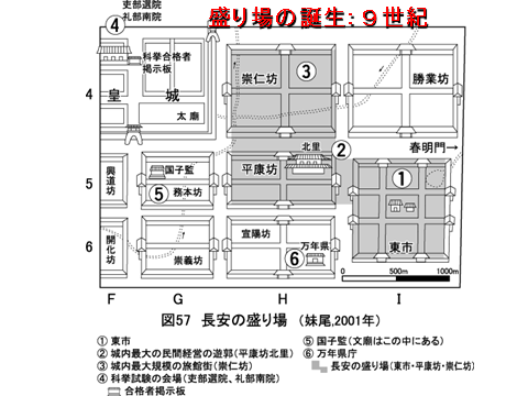 回過頭看隋唐長安城的商業發展的情形,以中央朱雀大街為界,東邊(城東)多為官人居住的地方;西邊則是平民與胡商聚集的地方,尤其在大明宮興建完成後,更加明顯。靠近東市的平康坊,由於進奏院都在附近,甚至發展為長安的紅燈區,又被唐人稱為北里,一旁的崇仁坊也成為酒樓聚集的坊。兩坊連結東市,形成長安城的「蛋黃區」,當時人描述幾個坊說:「因是一街輻輳,遂傾兩市,晝夜喧呼,燈火不絕,京中諸坊,莫之與比」。同時,日本學者妹尾達彥對於長安城的復原研究,也呈現長安城坊中,有許多的商店。