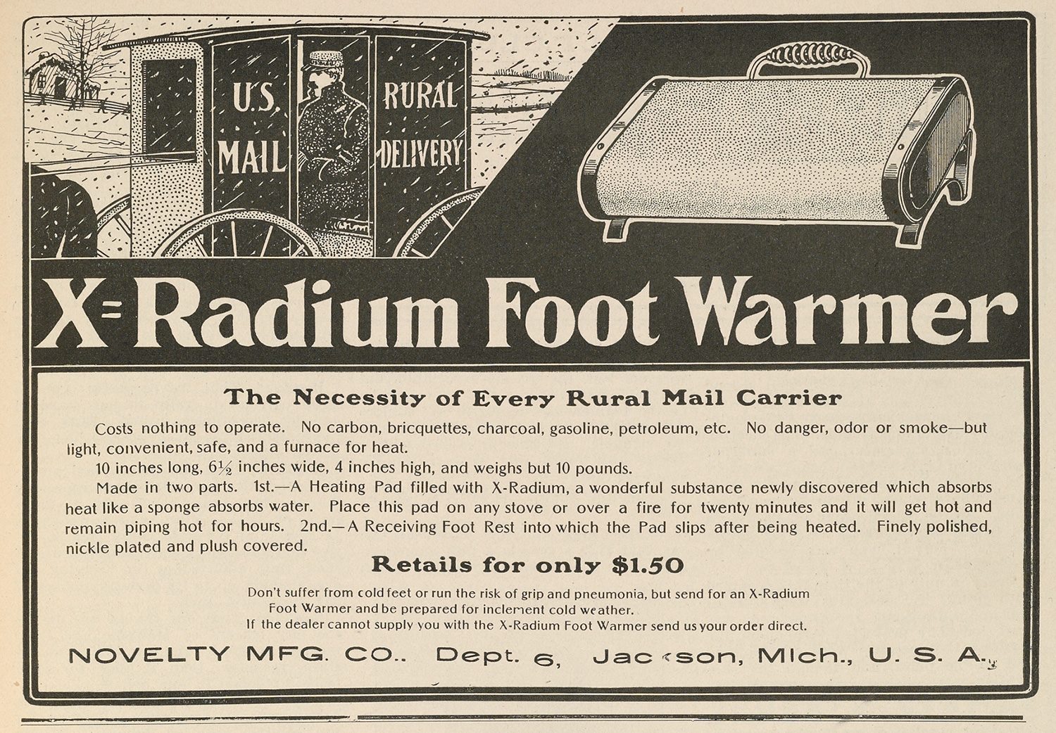 在鐳(Radium)已被發現的二十世紀初期,當時的人們只知道鐳的好處,對它的危害尚一無所知,鐳被當成對健康相當有益的成份,任何商品只要添加此熱門成分必會賣翻天。