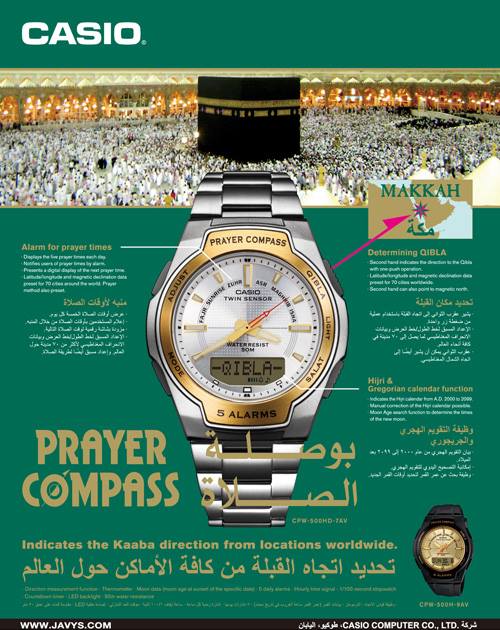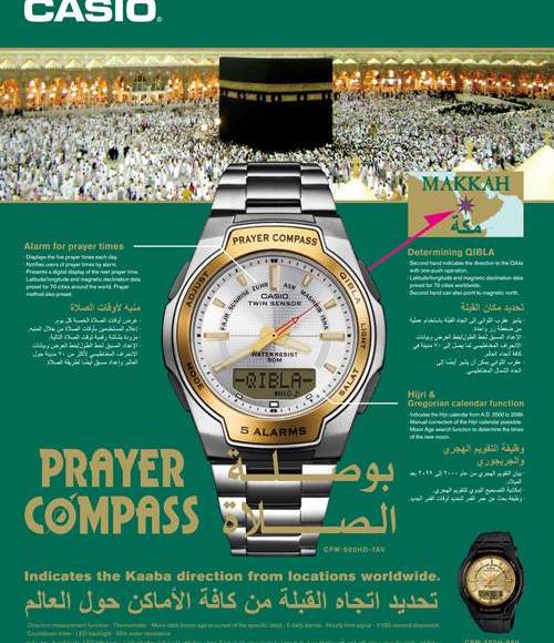 日本卡西歐公司在 1993 年推出了附有方位計的登山用手錶,在將這個技術應用更成熟之後,他們於 1997 年推出一系列名為「Prayer Compass」的手錶,這系列錶款可說是專為穆斯林設計,因穆斯林每天須向伊斯蘭聖地麥加的方向禮拜五次,禮拜時間也不固定,是依太陽的位置而定,例如「影子是自己身長的兩倍時直到太陽下山前」,會依所在地的經緯度和季節而有所變動,非固定的幾點幾分。而這系列手錶的主打功能不但可指出麥加的方向,還附有伊斯蘭曆,標示伊斯蘭各大節日如古爾邦節(宰牲節)和開齋節等,並且還有自動計算、提醒每日禮拜時間的機能,讓身處伊斯蘭文化圈外的穆斯林不管身在何處都能按時朝拜。
