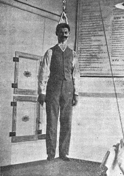 同樣的手法經過多次試驗及記錄後,Minovici 找來了兩位助手,而他的實驗方式也愈加危險。兩位助手將他由地板垂直吊起,其中一位大聲讀秒,讓 Minovici 就算耳鳴也能聽得到已經過了多久時間;他的喉嚨感到一陣難以忍受的強烈痛楚,氣管被勒緊,並不由自主地閉起雙眼,過了幾秒鐘,他才瘋狂地指示助手將他放下。Minovici 對這次失敗的實驗一點都不灰心,他勤加練習,讓自己更習慣上吊,每次至少四、五秒鐘,而練習的成果相當可觀,在離地面幾公尺高的狀況下,他可以忍受被吊起的極限長達二十五秒鐘。