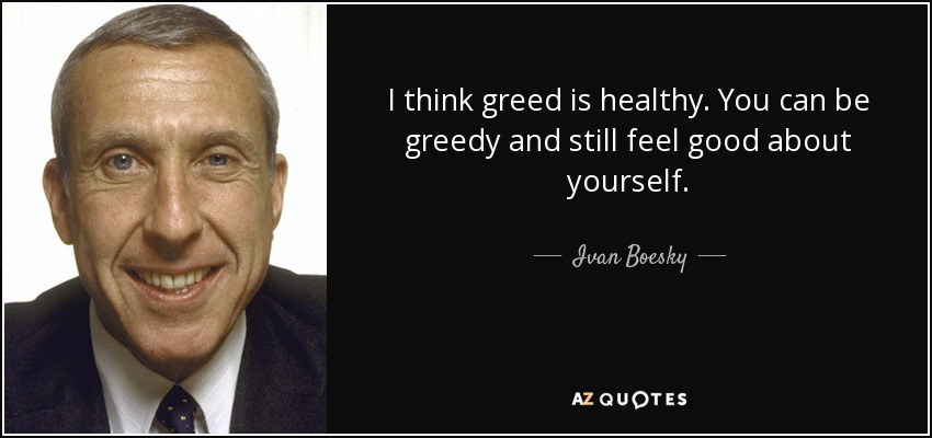 「附帶一提,我希望你們知道,貪婪沒有錯。我認為貪婪是健康的。你可以一方面是貪婪的人,同時自我感覺完全良好無缺。」