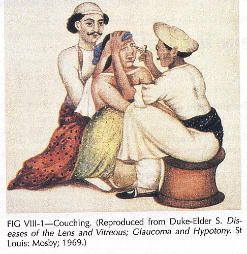 所謂的「金針撥障」,其實是相當古老的白內障手術。原理是以針將水晶體周圍的懸韌帶割斷,讓混濁而阻擋光線的水晶體落入玻璃體腔內,讓病患能短暫的重見光明(但會成為高達 1500 度的遠視患者)。