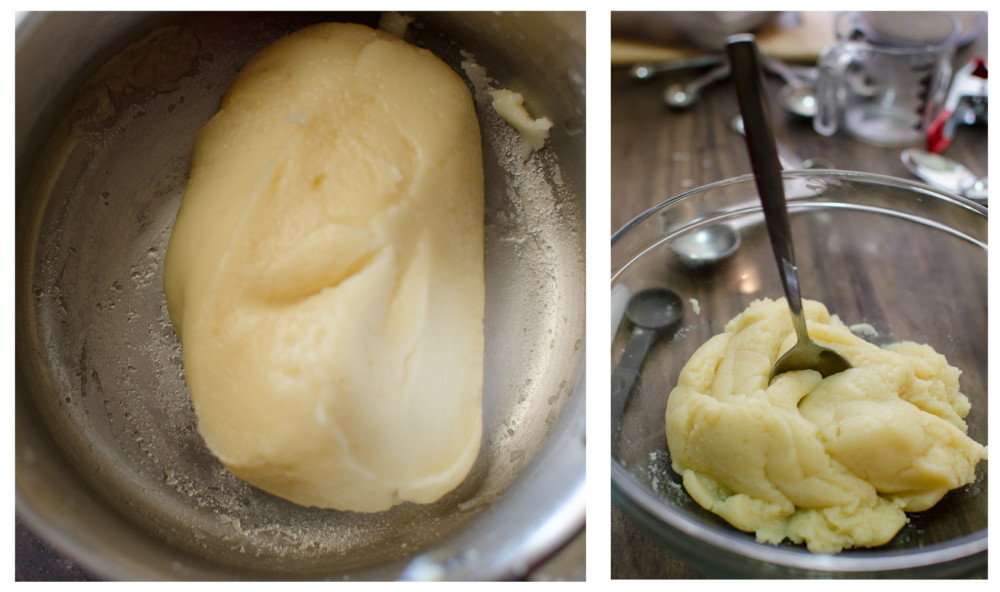 泡芙送進烤箱前,會有個加熱麵團的步驟,藉由迅速攪打麵團並加熱,將麵團糊化。糊化的功能在於使麵團更有延展性。有延展性差很大嗎?對,差很大。
