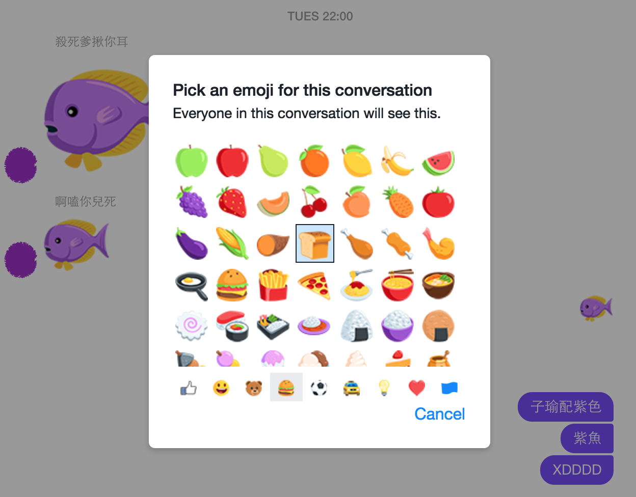 而更改視窗顏色與 Emoji 這項功能,其實只要使用手機的 Messenger APP 就可以做到,但是手機上的 Emoji 有其限制,像是萬聖節常用的南瓜,或是我們隨意亂換的吐司碟 (?),就沒有出現在 iOS 的手機預設 Emoji 裡面。