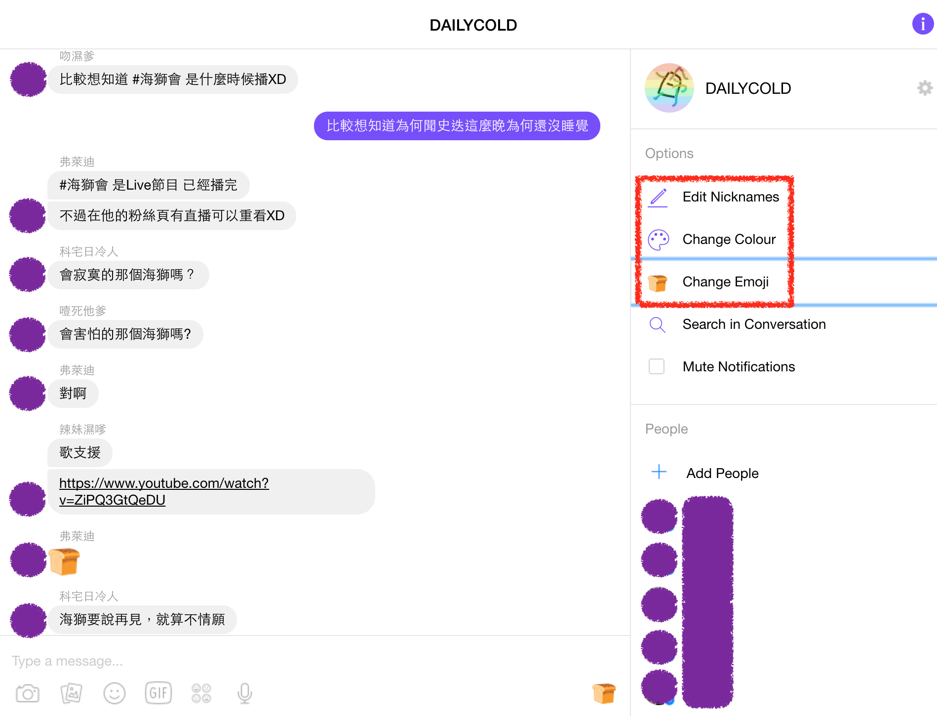這項功能不論是單獨聊天的朋友或是聊天室裡的眾人,都可以隨意更改,並且會在群組中以這個暱稱出現。看看每日一冷群組裡被改得亂七八糟的暱稱就知道冷編輯們已經玩了多少回XD