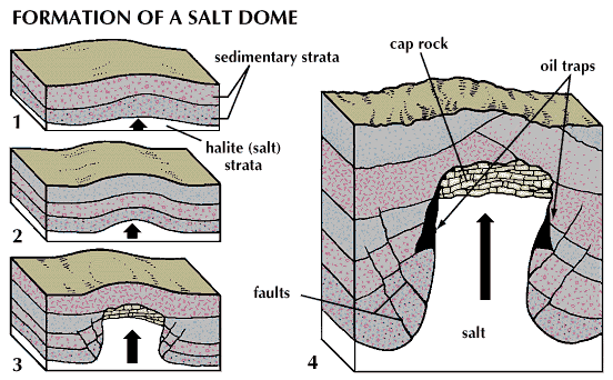 岩鹽的逆襲(!)常會把上方的地層頂成同心圓穹頂狀,有時破裂形成斷層,地質學家有個很拉風的名字稱呼穹頂形狀的地層--背斜構造(anticline)。高中地球科學課有專心聽的同學應該記得,背斜構造是適合石油、天然氣儲藏的天然陷阱(trap)。更棒的是岩鹽本身也是超低孔隙的不透水也不透油更不透天然氣的構造--背斜加不透水層,這就是為啥鹽丘會是尋找石油的理想地質標誌。相關知識對石油企業重要的程度,使得地質學特別劃出一個分支叫「岩鹽構造學」(salt tectonics)。