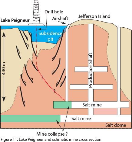 倉皇逃命的加迪森絕對猜不到,這股惡水居然是一群鑽探石油的人搞的鬼。戴維斯等人在規劃鑽探時,當然知道這座「鑽石結晶」(Diamond Crystal)鹽礦存在,也和礦業公司取得了坑道位置圖。但不知道怎麼搞的,組裝鑽油平台時負責三角定位--顧名思義就是取三個定點,測量相對位置以決定鑽探位置--的某個傢伙把其中一個點標錯了,使得鑽油平台的位置向鹽礦靠近了大約 120 公尺。