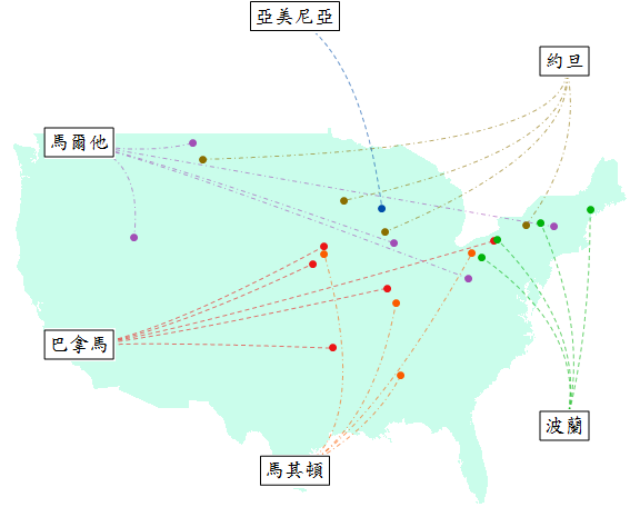 到這邊大概可以觀察出,這些假鬼假怪的異國地名位於美國中部與東部的比西部多。