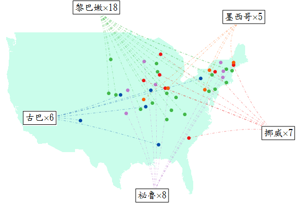 因為繪製難度太高,我必須把少數在阿拉斯加州等非美國本土的地名剔除。