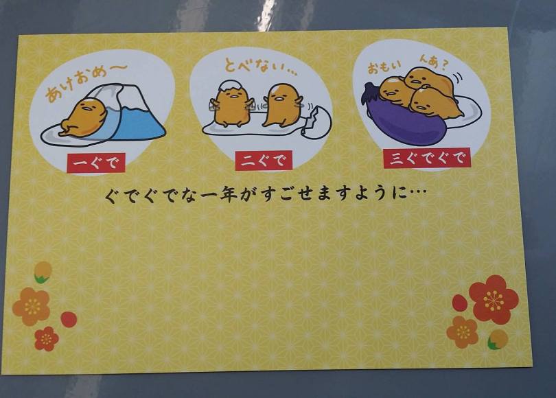 Mr. Thursday Jr. 上週到日本旅行時看到這張有趣的賀年卡,發現蛋黃哥除了跟富士山與茄子合照外,還有一個想飛但是飛不起來的可愛表情,就在邊散發愛心讚嘆好可愛邊挑出錢包的同時,不禁好奇起這些圖案究竟是什麼意思啊?