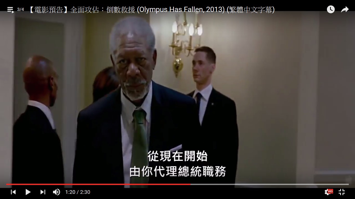 在電影《全面攻佔:倒數救援》中,白宮遭遇襲擊,美國總統被扣為人質,由摩根.費里曼代理總統職務。(預告片當中的 1 : 20 - 1 : 26 )