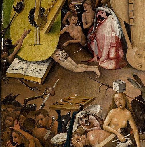 目前確認出自波希之手的畫作僅有二十五幅,他最有名的三聯畫(triptych)《人間樂園》(The Garden of Earthly Delights)由左至右的主題分別是伊甸園、人間的樂園、地獄,而在最右邊的地獄裡充滿象徵世俗享樂的樂器、暗喻男女性事的刀和雙耳、意指賭博的撲克牌和骰子,全都是描繪人類之罪的元素。其中,靠左側的魯特琴下方壓著一個只露出下半身的人,他的屁股上還畫著以早期記譜法寫成的四線譜。