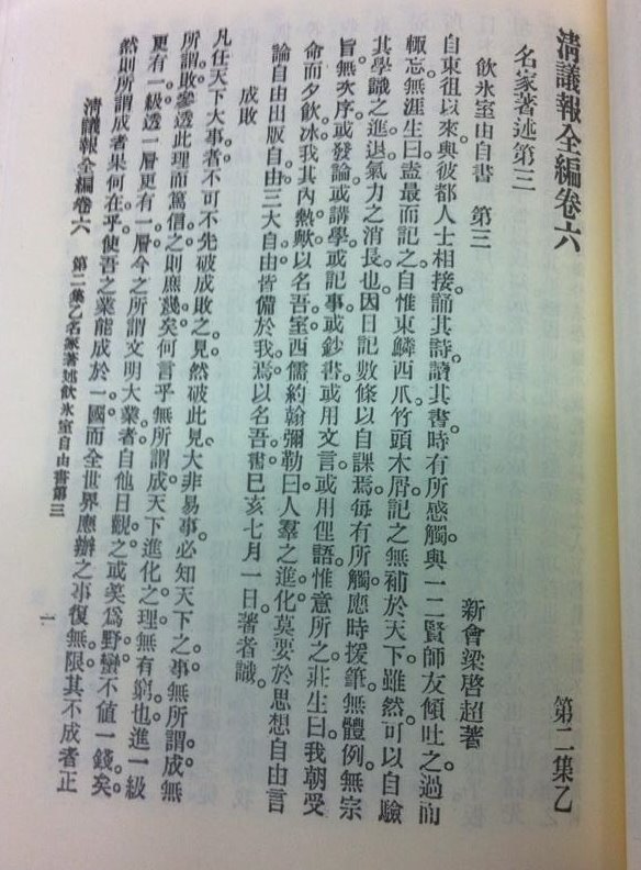 1899 年 8 月 6 日(己亥年七月一日),梁啟超在他所創辦的《清議報》上以「飲冰室自由書」為題目開設專欄,在序中提到了「飲冰室」一名的由來。