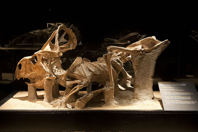 我們小時候最熟悉的三角龍便是原角龍的遠親,只不過三角龍生存於北美洲,時間比原角龍晚個數百萬年,屬於晚期白堊紀。