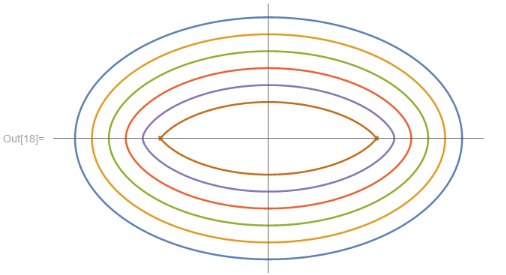 因為長寬不相等,若我們將橢圓形的周長上的每一個點,垂直往內推一個相等的距離───例如像圓形競技場的一圈圈觀眾席般往內縮,最後內圈的「橢圓」的形狀會越來越扁,事實上它們已經不是橢圓形了,如下圖。