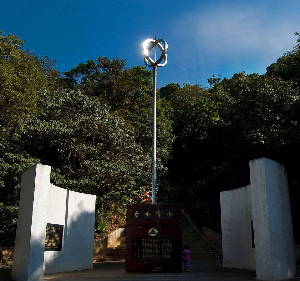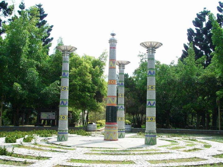 其實,早在一百多年前的 1906 年時,當時的日本人便已經測出臺灣的地理中心位在南投埔里虎頭山,並豎立了臺灣地理中心碑,而我們今天看到由白色弧牆環繞,中間碑座為三公尺高之赭色屏牌,上豎一柱不銹鋼桿,最上端頂著兩個相交的圓環,則是於 1979 年重建過後的模樣。底座上還有蔣經國在周書楷、魏景蒙及林洋港三人陪伴下巡視時,題下的「山清水秀」四字。也因此這座地理中心碑又被稱為山清水秀碑。